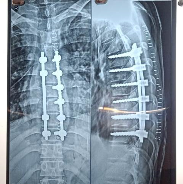 - Spinal fixation using titanium rods and screws to stabilize the spine